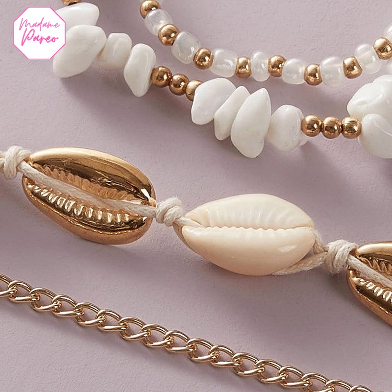 Faites le plein de bonne humeur et ajoutez une note de légèreté à votre style avec ces bijoux ethniques. Sublimées par des perles dorées, les coquilles blanches de ces chaînes de cheville coquillages et perles sont parfaites pour souligner un hâle naturel. Le mariage des coquillages aux teintes blanches et dorées apporte une touche maritime raffinée à votre look.