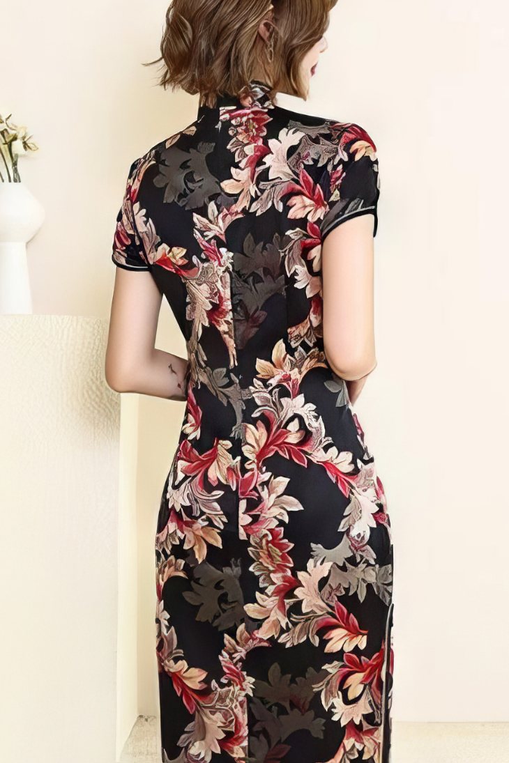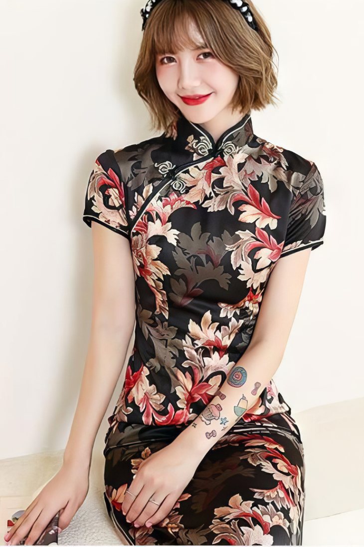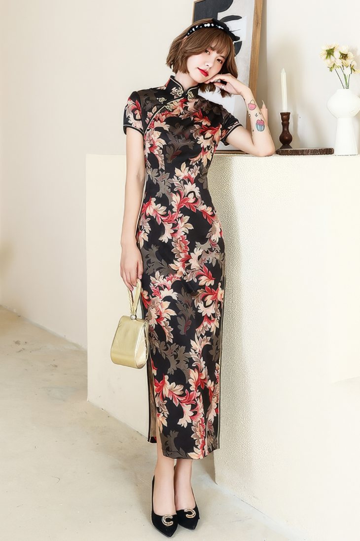 Fabriquée en tissu brodé avec des motifs floraux, cette robe évoque l’âge d’or de la mode chinoise. Elle présente un col mandarin fidèle à la tradition, avec une coupe mi-longue qui offre une silhouette élancée.
