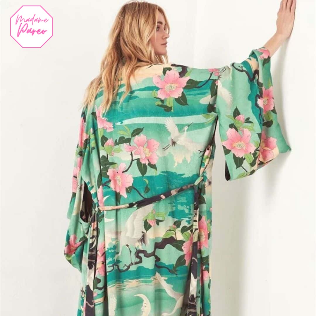 L’élégance de notre Kimono de Plage Avec Ceinture Effet Floral rayonne par sa qualité de tissus et par sa coupe fluide qui épouse délicatement votre silhouette. Cet atout mode s’inspire des traditions asiatiques tout en capturant l’esprit zen japonais, idéal pour des moments de détente en vacances. En nouant la ceinture fournie, vous transformez instantanément ce kimono en une robe légère pleine d’allure et de chic.