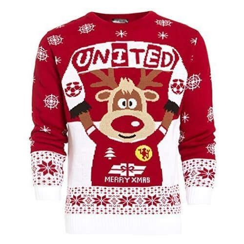 - avec renne habillé en t-shirt rouge du club avec le logo Manchester United, un cadeau et un sapin et l’inscription Merry Christmas