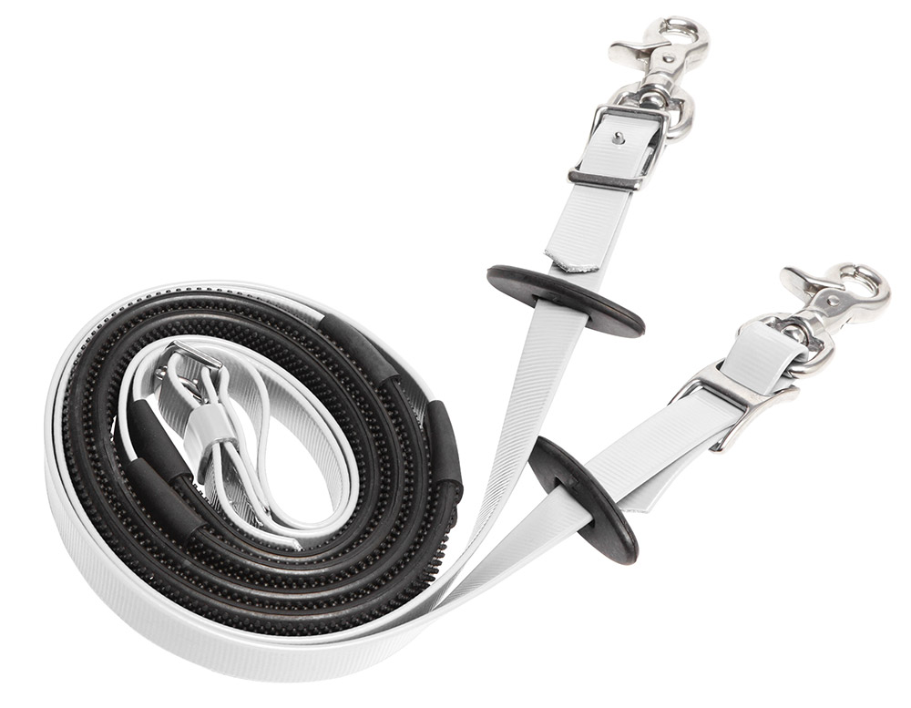Rêne Endurance Deluxe Zilco (Inox) : Rênes qui se fixent facilement aux mors grâce à deux solides mousquetons inoxydables de la gamme Inox. Grip caoutchouc à «petits picots». Boucle au centre. Matière : En Synthétique ZILCO avec caoutchouc pour améliorer le grip et bouclerie en Inox : Fabriqué à partir de sangle recouverte d’un co-polymère, comparable au Biothane. Offre une grande robustesse et souplesse. Facile d’entretien et non échauffant. Reste souple même quand il fait froid. 14 couleurs disponibles y compris le blanc : Blanc, Noir, Bleu Foncé, Marron, Jaune, Vert Foncé, Violet, Rouge, Bordeaux, Bleu Royal, Vert Clair, Bleu Cyan, Rose.…