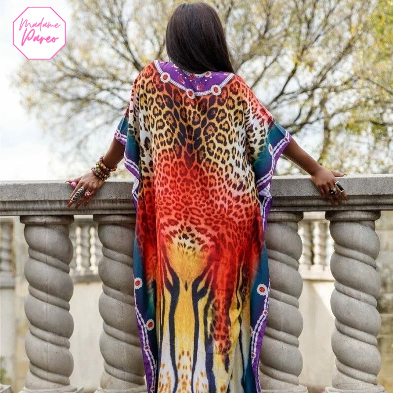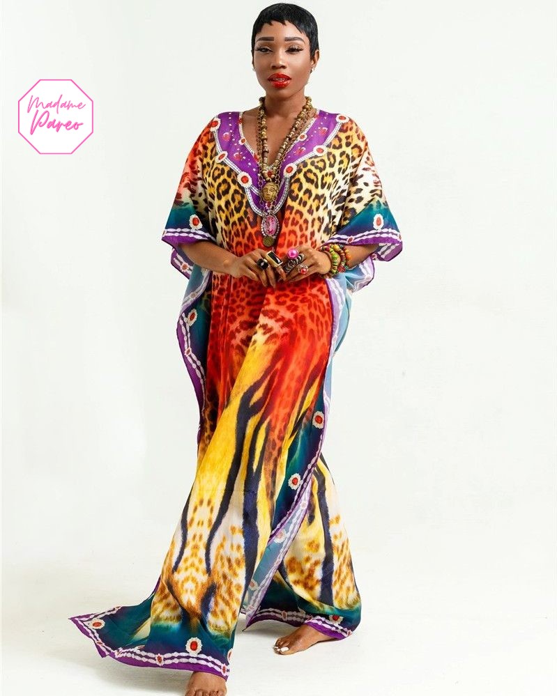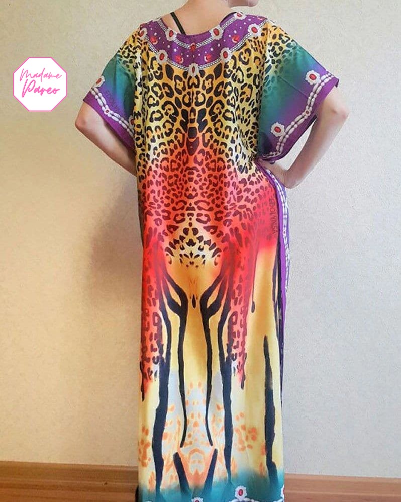 Affichez un style inimitable sur les plages ou au bord de la piscine avec notre robe paréo africain imprimé léopard. Facile à enfiler, elle vous pare d’une grâce sans effort en dissimulant élégamment les formes que vous préférez ne pas afficher.