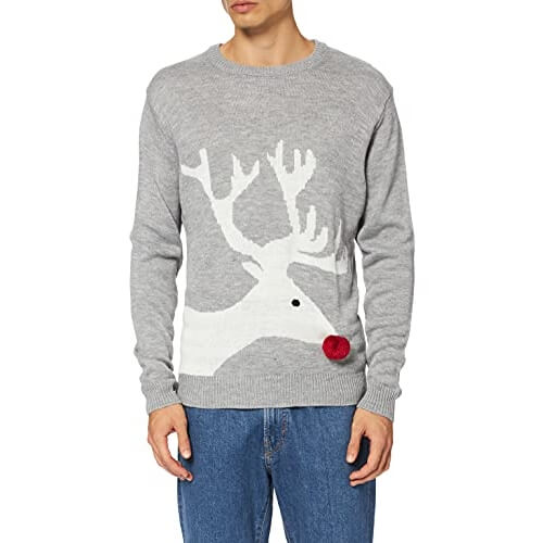 Vous vous souvenez de Rodolphe, le renne au nez rouge ? Oubliez tout ce que vous savez sur ce personnage emblématique de Noël. Ce pull prend l’image de Rodolphe et la transforme en une sorte de spectre difforme. Le pompon rouge, censé être son nez, est la seule chose qui rappelle vaguement le personnage original.