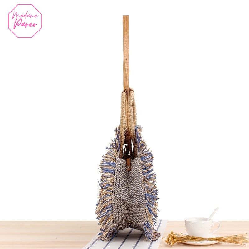 A la question « Pourquoi choisir ce sac rond à franges ? », la réponse est évidente : sa polyvalence. Que vous prévoyiez une session shopping intensive ou une excursion relaxante à la plage, sa contenance généreuse saura accueillir vos emplettes comme vos essentiels de bord de mer, incluant serviette, maillot de bain et paréo.