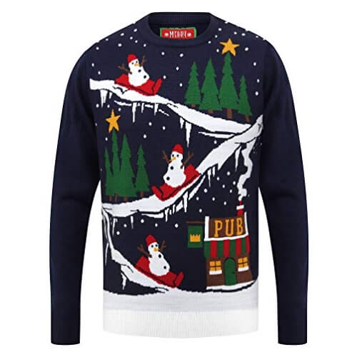 ZigZag Pub – Bonhomme de Neige sur Luge – Pull de Noël Kitsch
